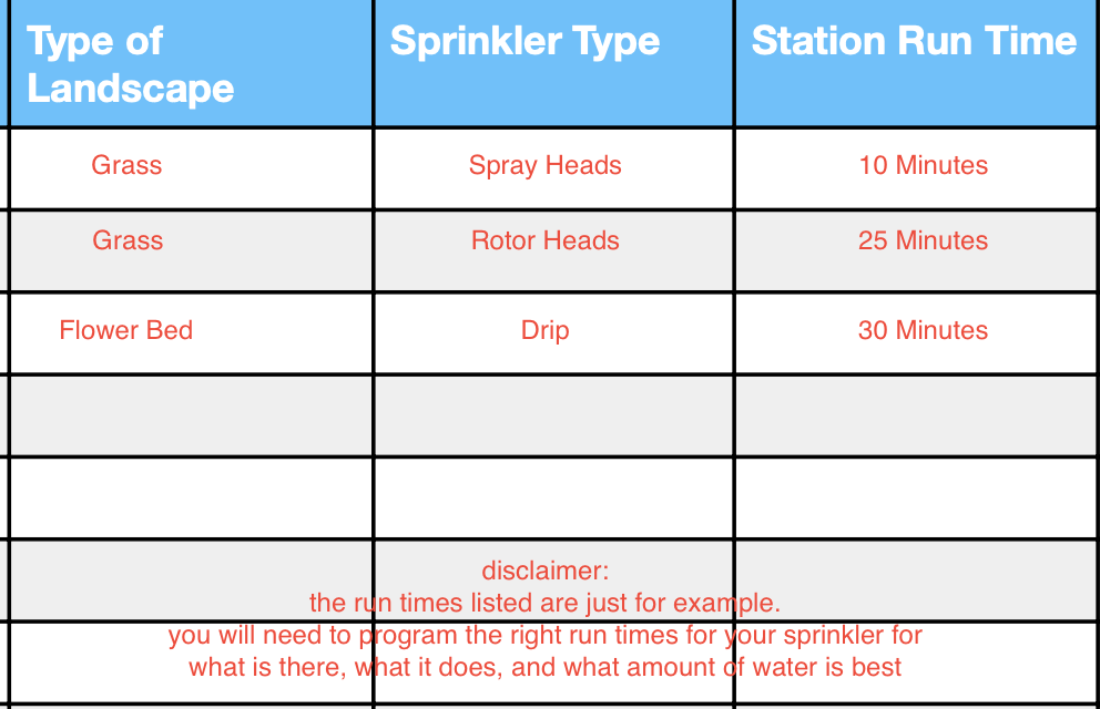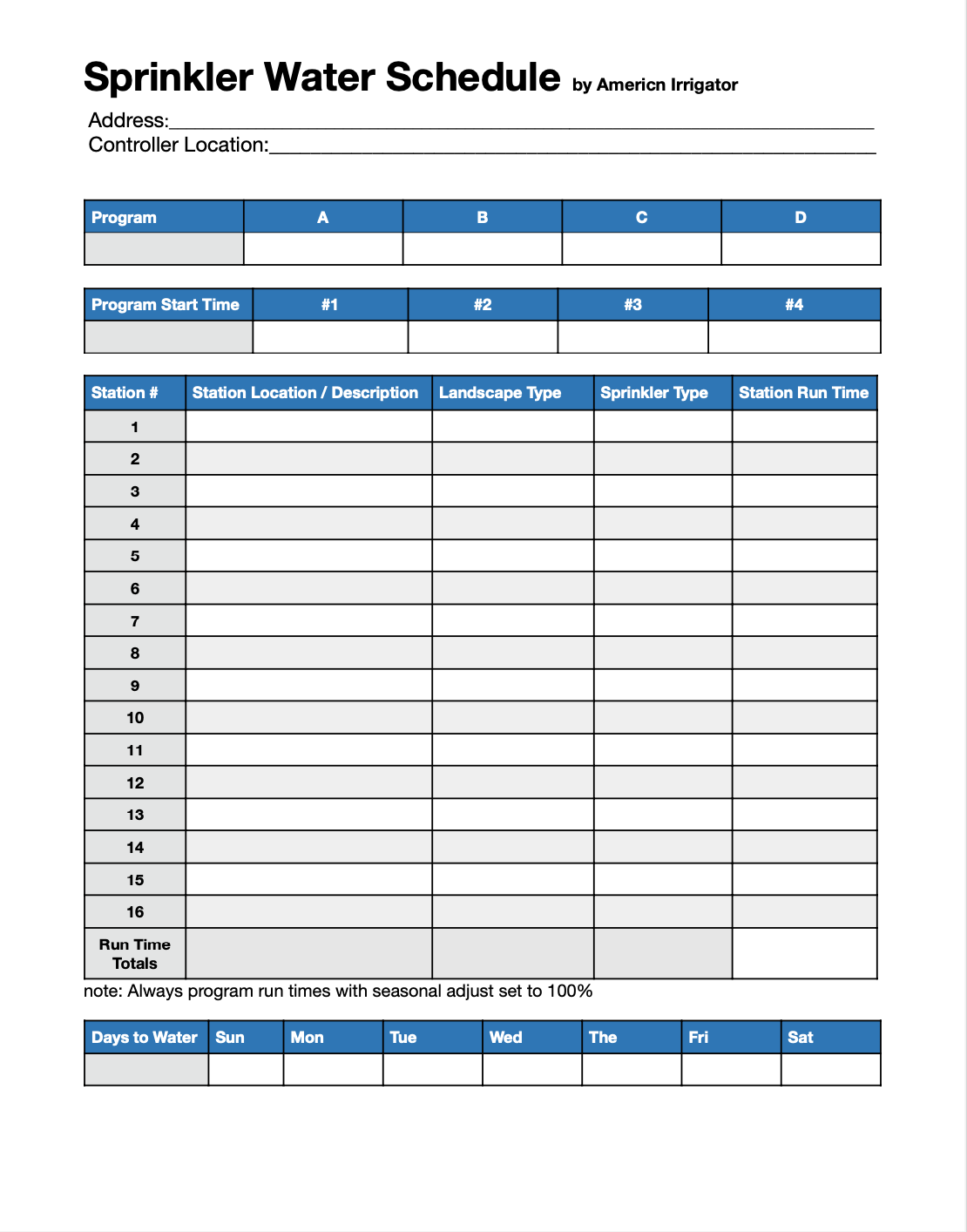 I made this water schedule because I was tired of the regular door hanger schedule you get with the controller. I needed and wanted more information in order to program the sprinkler systems I was installing and maintaining correctly. It has always been hard to organize and label a system with the little door hanger and be able to figure out what is actually programmed. Don't get me wrong, I still use the provided door hanger in some cases and it is good for minimal information, but it has never been what I wanted. So I made this sprinkler water schedule to get everything I like to know to program a sprinkler system correctly and efficiently. It is especially handy for making adjustments when needed. For example, I was checking a system the other day and noticed a section looking dry. I knew it was the south end of the parking lot but I did not know what number it was, off the top of my head or which zone ran that particular section. So I went to the controller, which is in a back utility closet and referenced the water schedule that I had filled out and was able to determine the exact number of the zone based on the description and knowing what type of sprinklers were in the zone I could make the right adjustments to get the grass looking better. Having this sprinkler water schedule made it very easy to make this adjustment, I was able to do it really fast, and I was confident that I made the right adjustment because of the quick reference information that I had available.